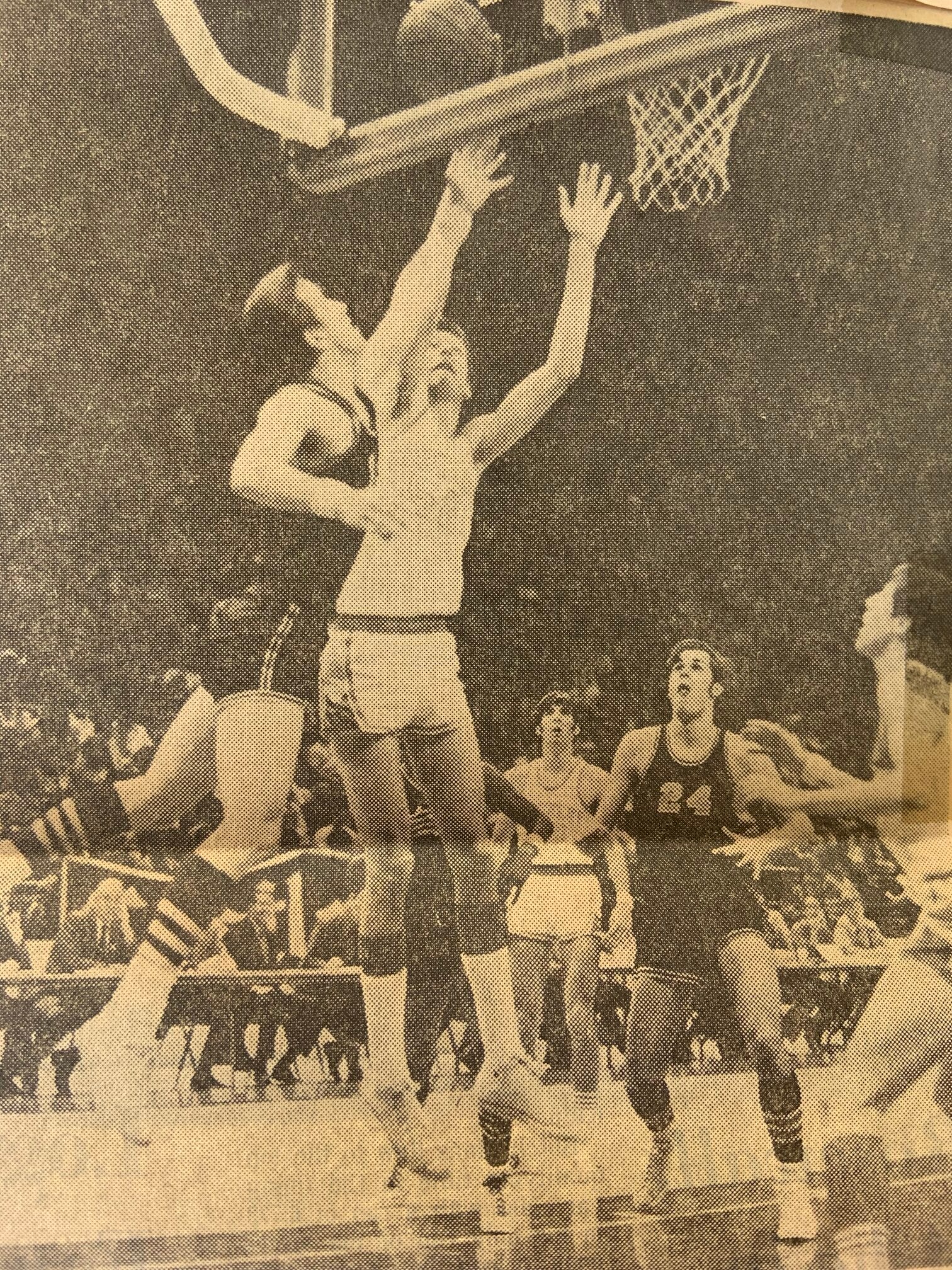 We have the ball and the chance to tie the game and send it into overtime. Dave Falkowski is my teammate, a guy I grew up with, and a guard like me. We have the ball on our side of the court near the half court line. Dave takes it out and bounces it into me. I turn and start up the court.